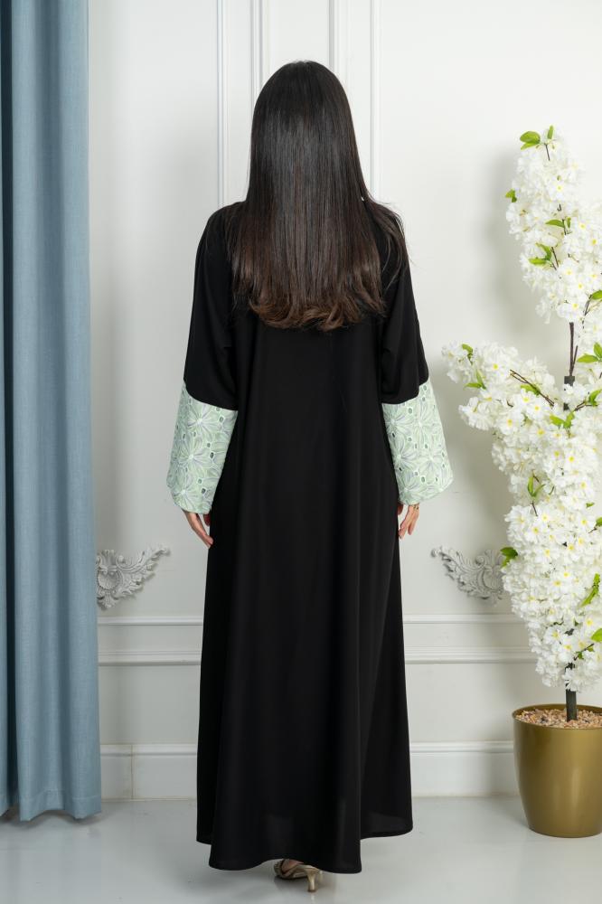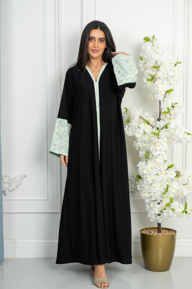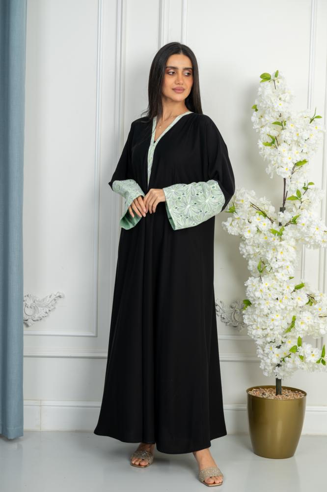 التطريز دومًا ما يمنح الحيوية لأي موديل، هذا الموديل بالتحديد يمتاز بأناقته العالية حيث أنه مصمم من قماش كريب ملكي باللون الأسود الفخم مع تطريز على الجوانب والجيوب تضيف رونق للعباية، وتجعلك ذات إطلالة متألقة دومًا عند ارتدائها،