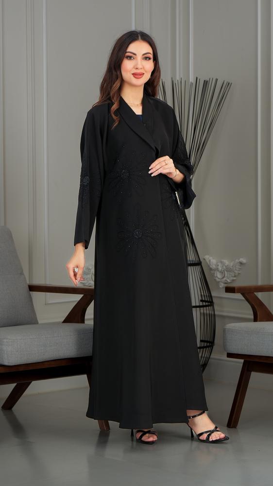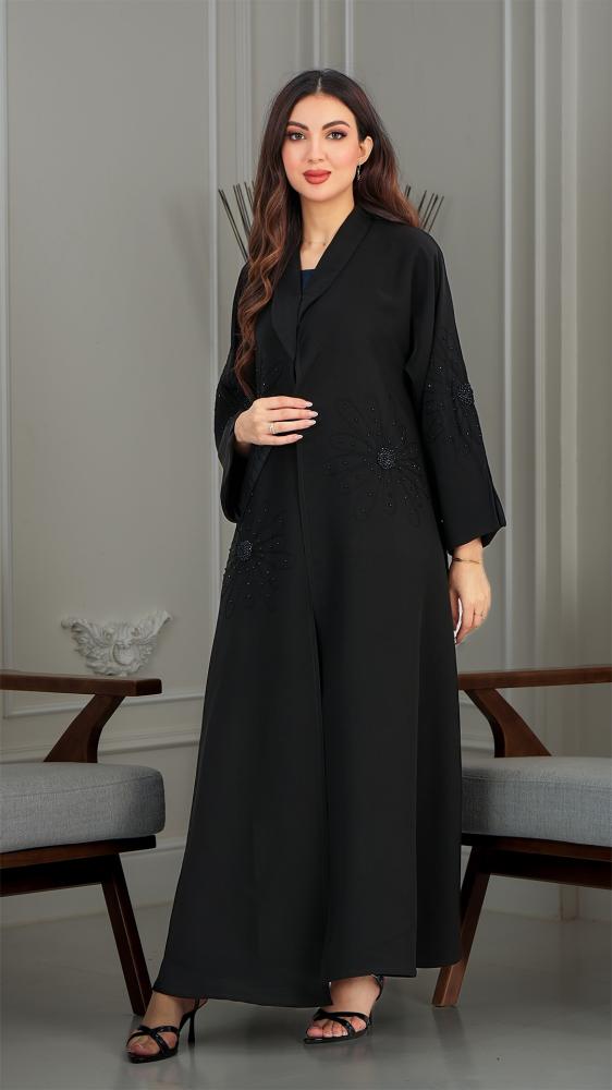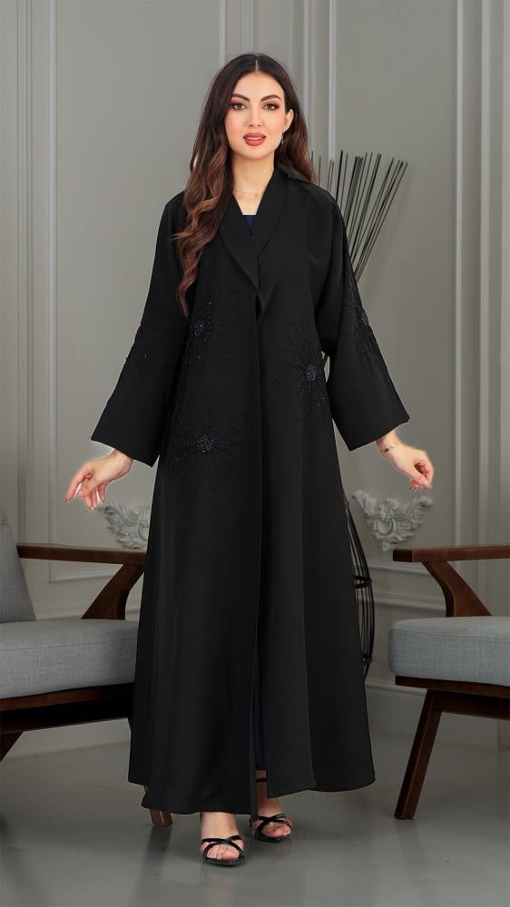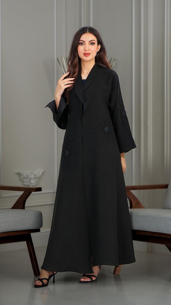 عبايه كريب زووم مزينه فالاكمام بفصوص وخرز باللون الاسود نوع القفله طقطق